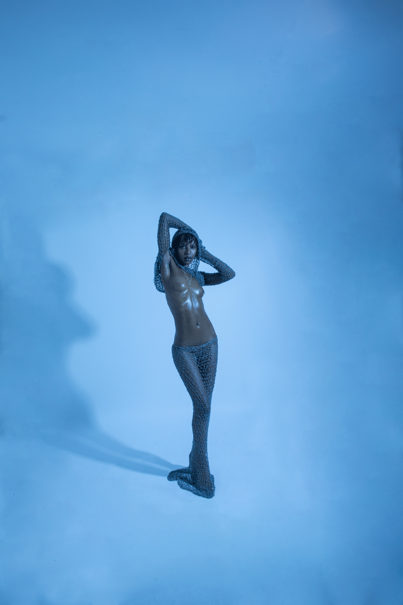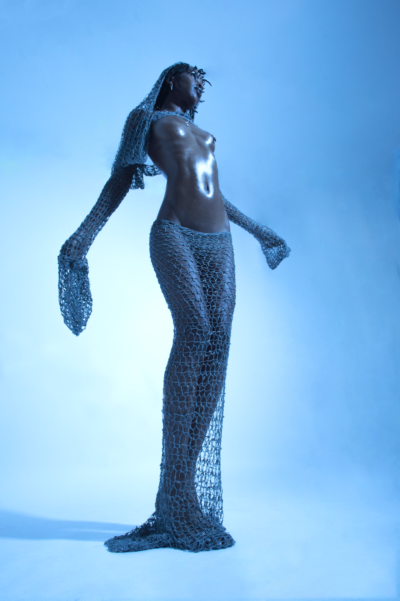 Featured in Hypebae Magazine, this editorial showcases muse Neema in a handmade crochet set in grey with gold accents. a maxi skirt and super-cropped top with a hood. Sensual, daring and unapologetically sexy.